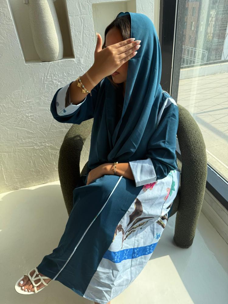عباية مصمّمة بعناية من قماش راما الناعم، المعروف بملمسه الراقي وسقوطه الانسيابي، تتزيّن بتدخيلات من قماش اللينن المطبوع الذي يضيف لمسة من الحيوية والتميّز