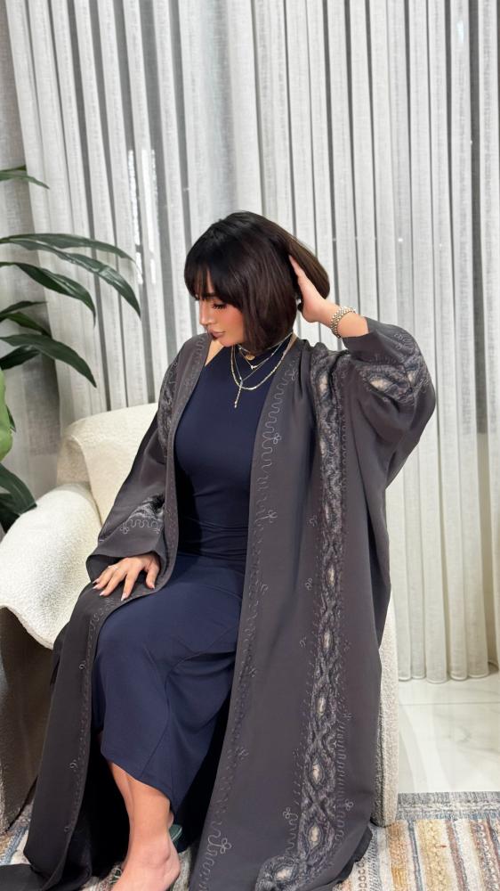 عباية أنيقة بلون هادئ مميّز، مزينة بتداخلات من قماش الكشمير الهندي الفاخر وتطريز ناعم يضفي لمسة فريدة من الأناقة.
