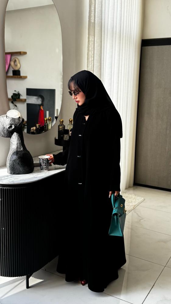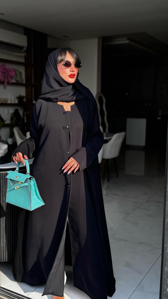 عباية رسمية باللون الأسود مصممة بذوق راقٍ وتفاصيل ناعمة، مزينة بأزرار أمامية تضيف لمسة فخامة وأناقة.